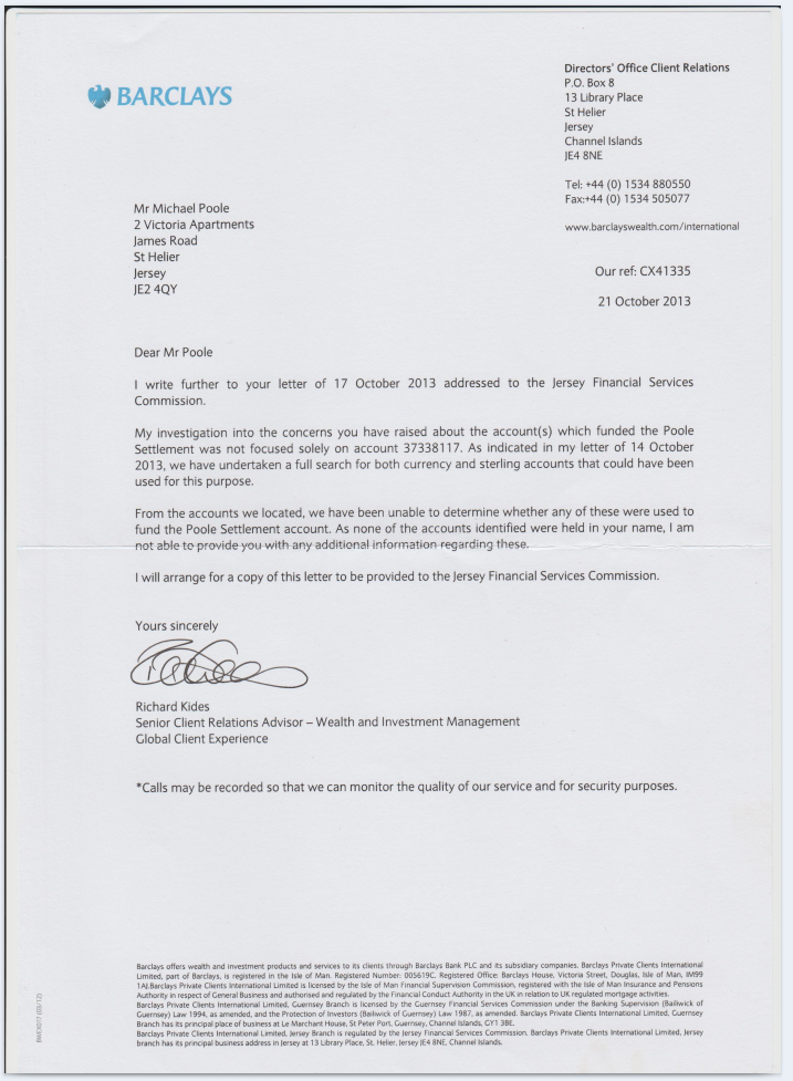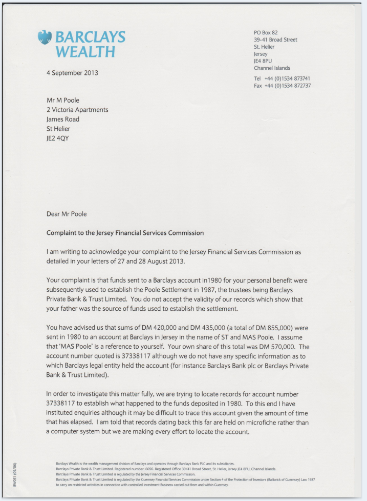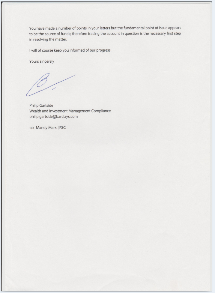 The letter above about his affaire with RBC worker Morag talks of my house proceeds being paid into my trust (para 2) and the letter below from the trust claims none of the funds paid into it sourced from my house proceeds