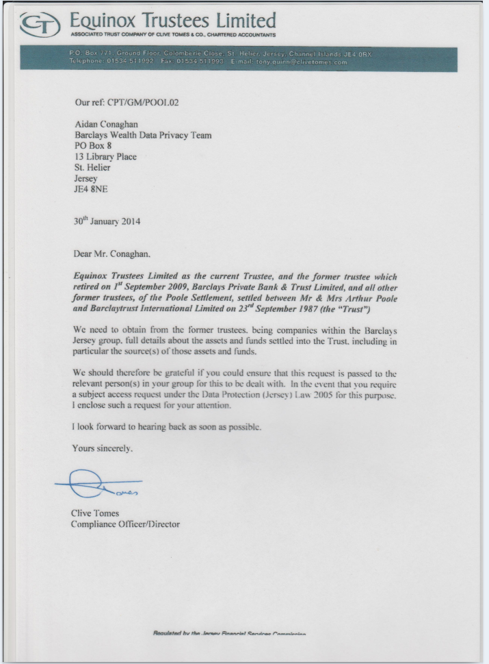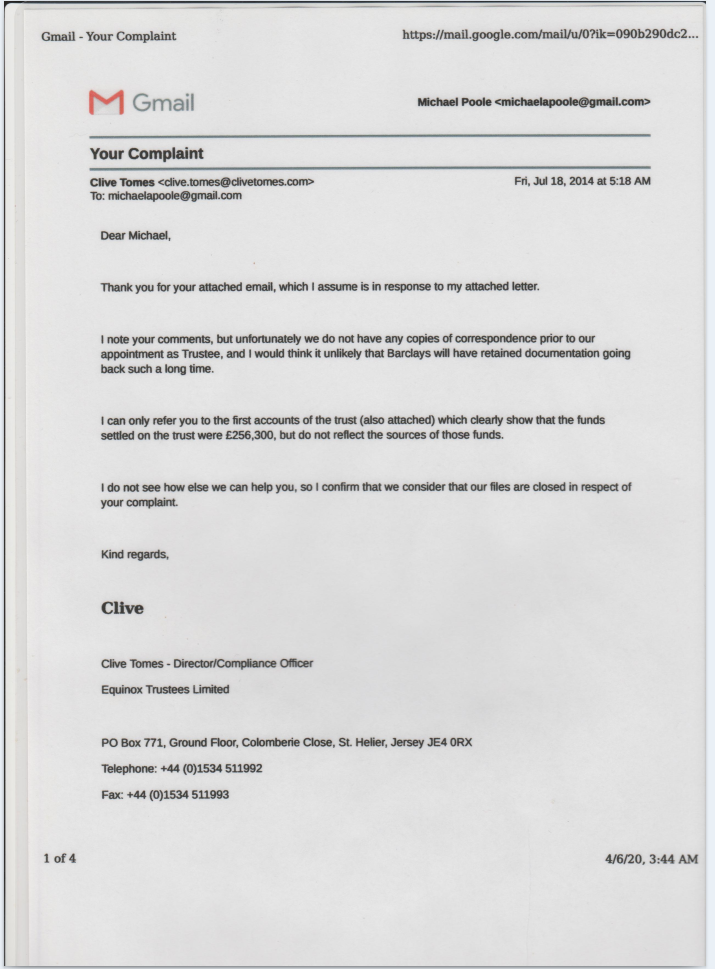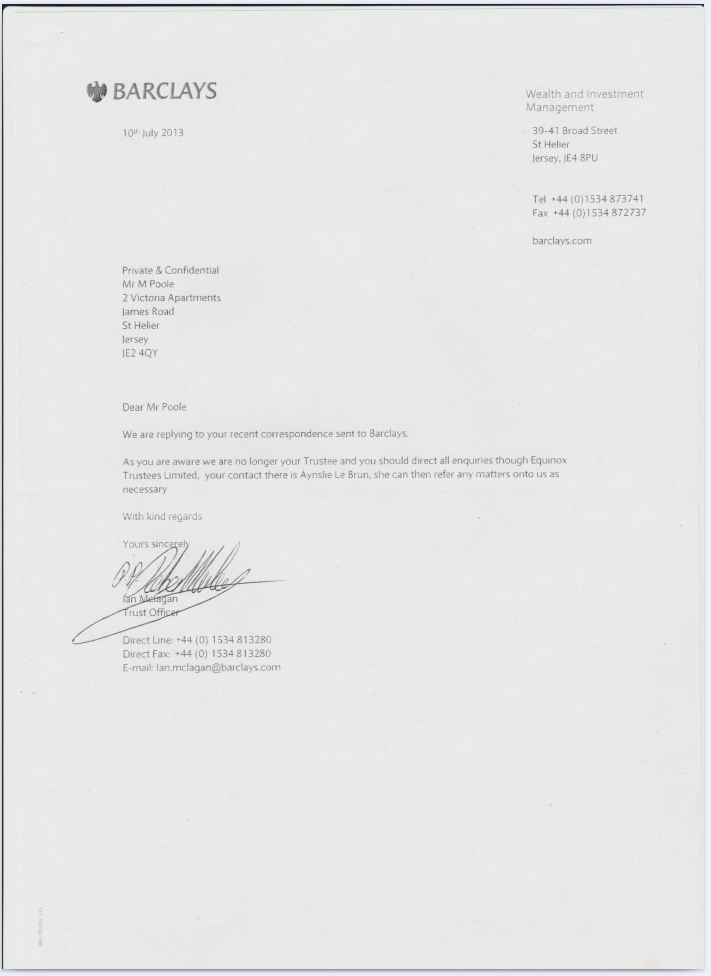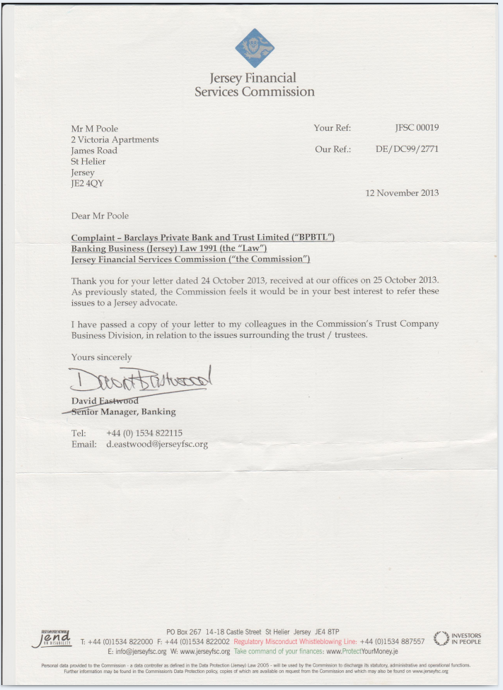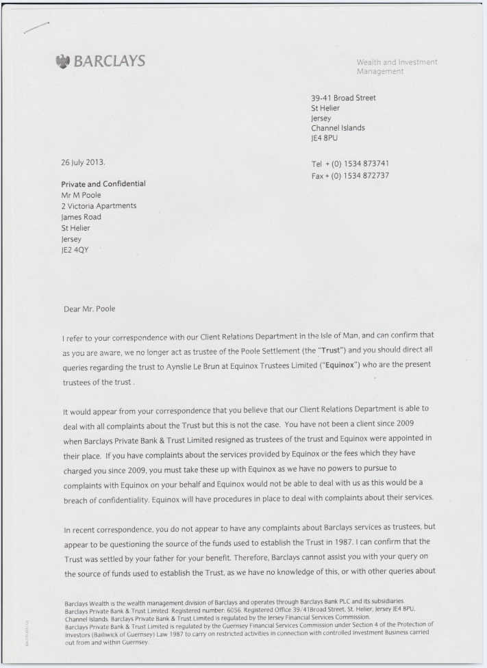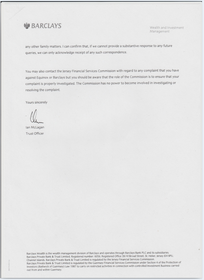 As can be seen further on up this blogsite, the claim in the letter above about the source of funds of the trust turned out, after complaining as instructed about how my complaint was handled to the JFSC, to be a fraudulent claim by the Barclays Empire going back 26 years.